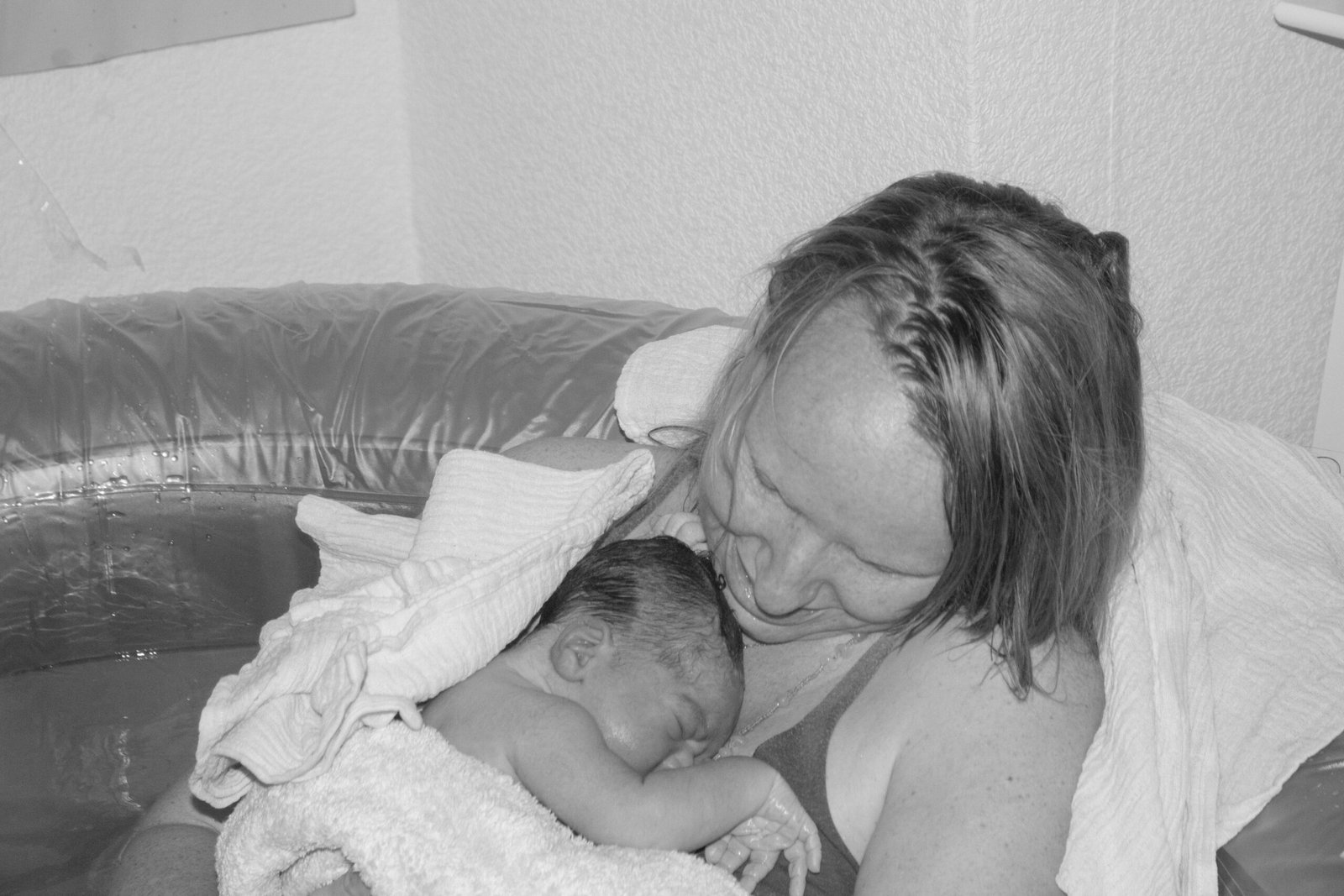 One of my legs was now up with the foot on the bottom of the pool and the other with the chin on the floor. I felt the urge to push and had both of my hands on my babies head. I held my hands as to welcome his with the next contraction but he didn’t turn, so in a quick moment which my midwife later told me was my intuition because he didn’t have enough room to move his shoulders, I stood up and with my hands on the rim of the pool I pushed just a little and he came. My husband and midwife stood behind me and caught him as he came out. I quickly sat back down and I had my baby in my arms. We did it. You and me and Daddy we went on this magical journey and welcomed you here. My midwife gave me and baby a towel to stay warm and then we got to know you. She quickly saw that you looked very well with an Apgar of 9 so there was no need to rub or suction or touch you in any way. We were just together and you didn’t cry. You came, immediately laid on my chest and knew that you weren’t away but with mama just on the other side. What a journey. We called our son into the living room and together we looked if we had a new brother or sister. It was a brother! We stayed in the pool and enjoyed and got to know one another. Daddy and brother were looking from the outside of the pool and baby and I enjoyed the water together.